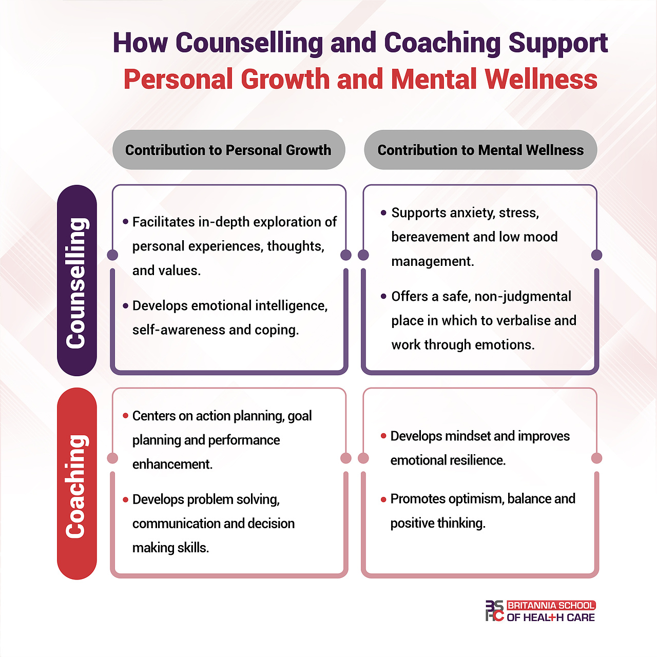 – Counselling targets emotional repair. It examines the past and handles feelings that shape present wellbeing.